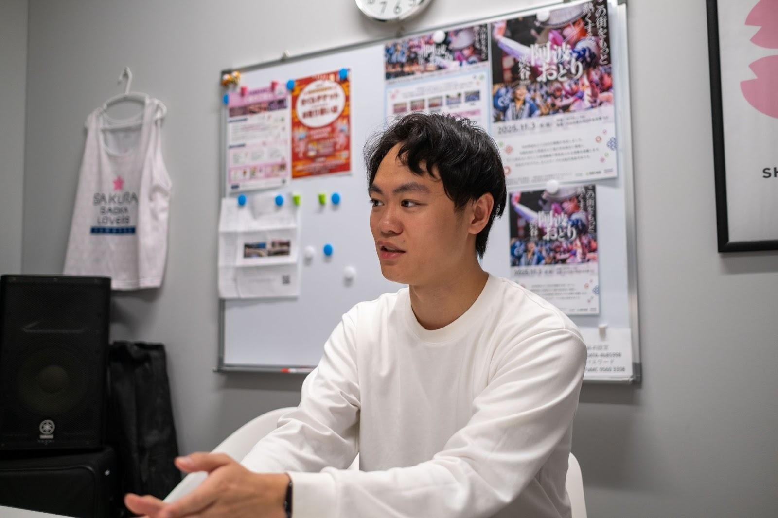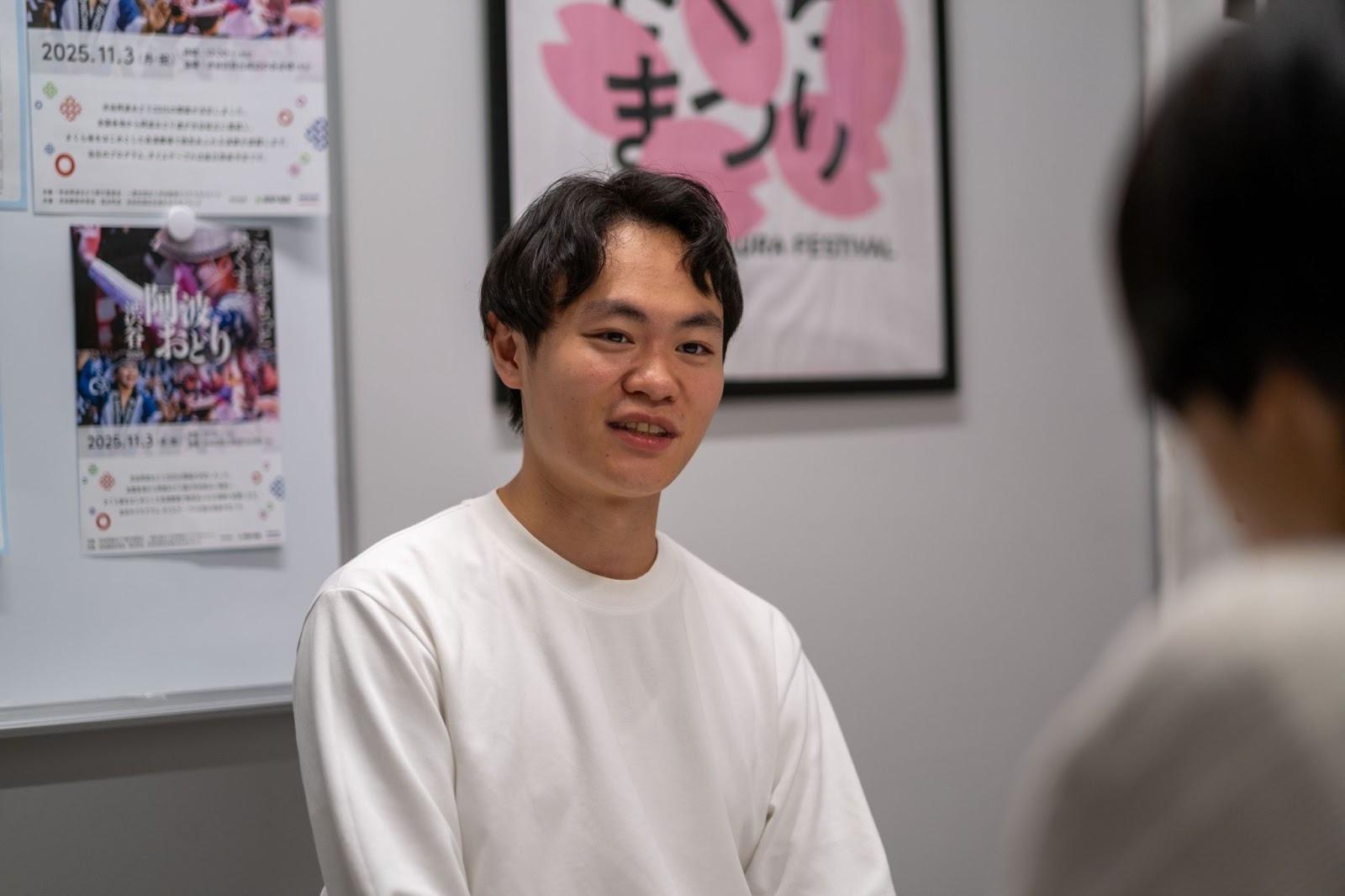 「僕は興味が発散的で、大学院で情報系を学びつつ、FOSを通した教育支援の活動、そして共栄会を通した桜丘のまちづくりなど、様々な分野に手を出しています。その中で僕は『日本を盛り上げたい』と思っています。その方法は様々あると思うので、1つの型のはまらずにこれからも様々な活動をしていけたらと思います」