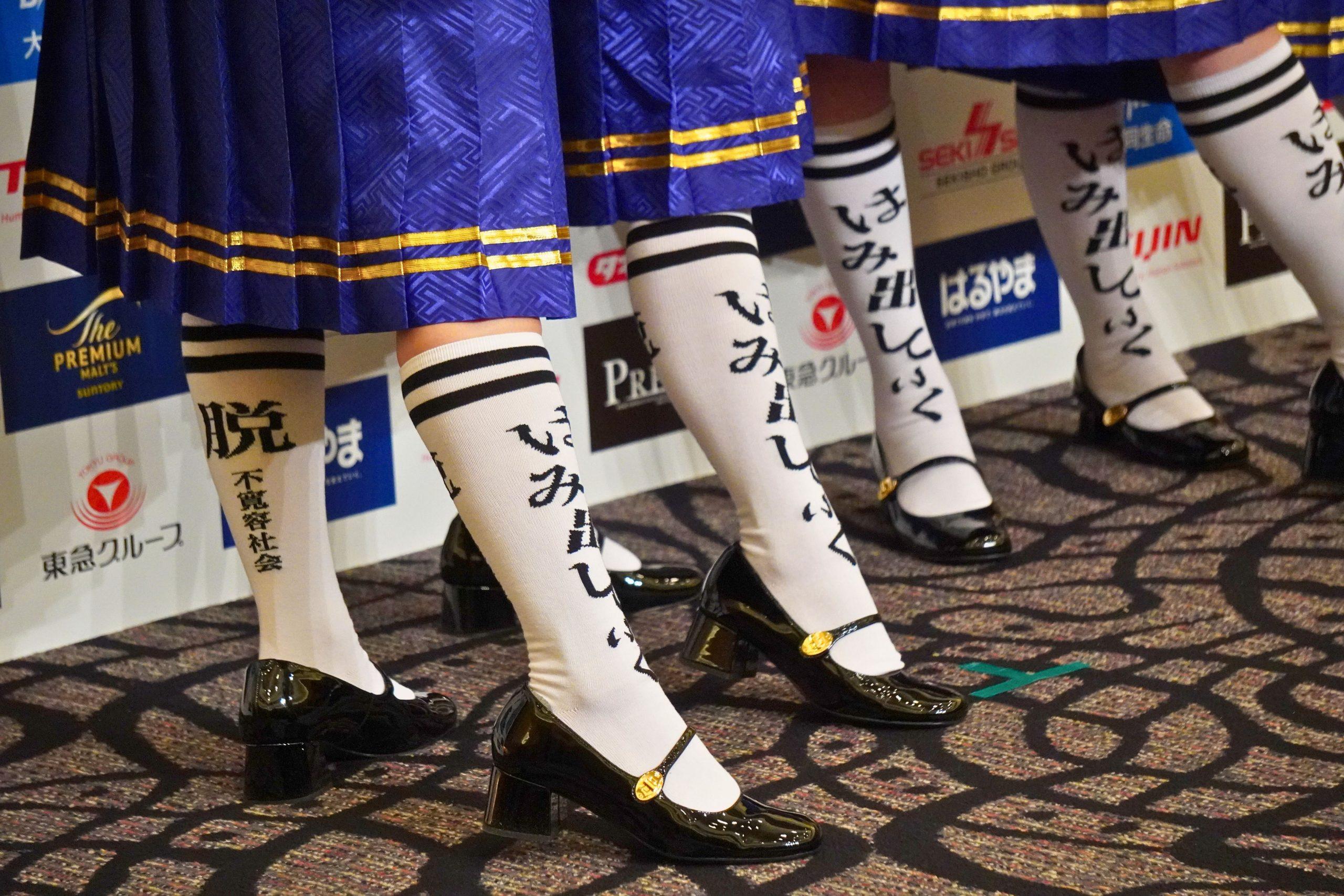 ソックスには「はみだしていく・脱不寛容社会」という大きな文字がデザインされ、結成当初からの理念である「自由にはみ出していく精神」を表現。