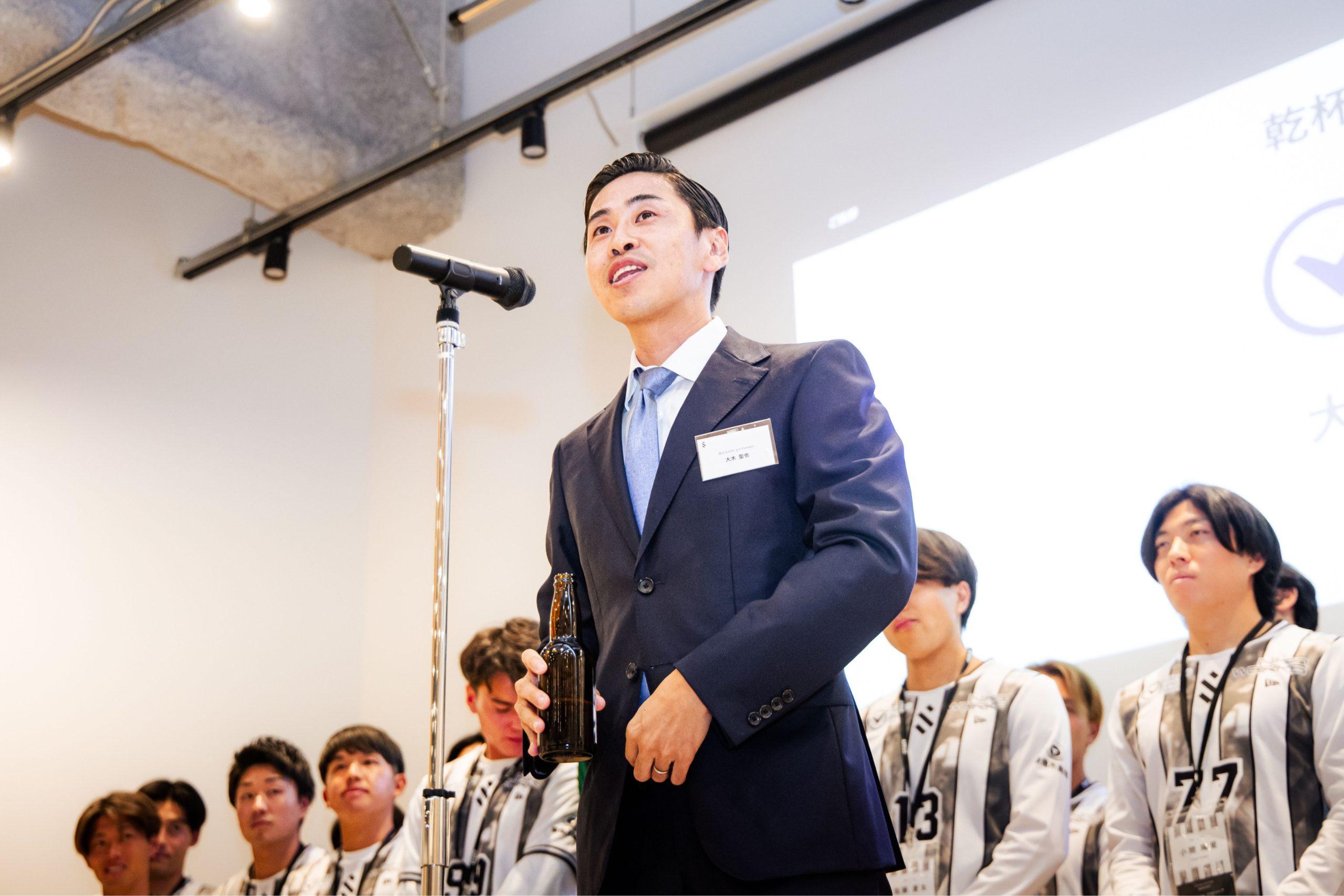 乾杯の音頭を務めた、オフィシャルトップパートナーである株式会社Re-grit Partners大木聖也さんは、YouTube配信での試合観戦を振り返り、