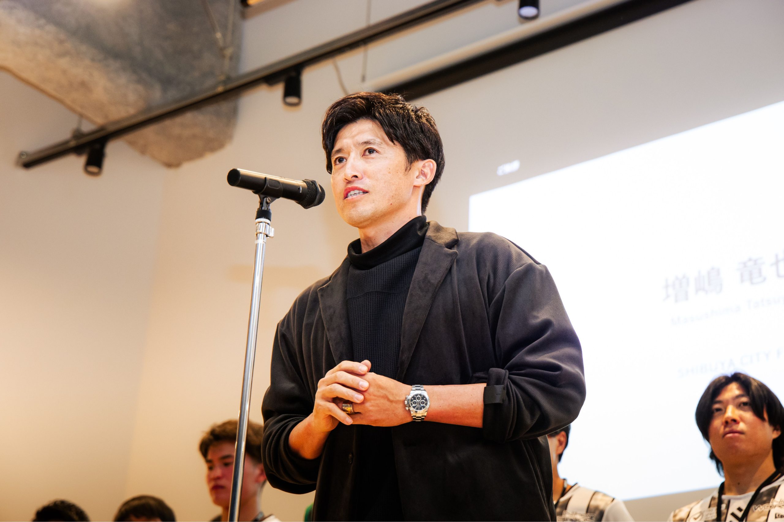 「SHIBUYA CITY FCの一番好きなところは翔さん(小泉翔さん)の解説。(ウィクラマラッチ 陸駆さんの)実況は完璧ですが、(翔さんの)解説は“解説していない”んです。『強い』『仕掛けろ』『スーパー』の三つだけ。見ている側の感情とまったく同じ解説というところが好きですね。その解説をやめないことが、来季もパートナーを続ける条件です」と冗談交じりに語ると、会場は大きな拍手に包まれました。