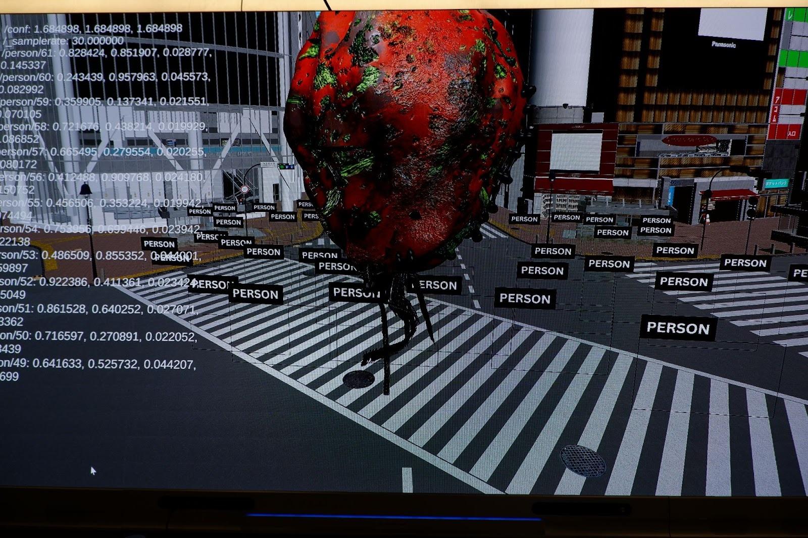 流れているLEDの映像は、24時間配信しているスクランブル交差点の映像をリアルタイムで取得して、それをビジュアライゼーションしています。この映像では、人間が通るたびに「PERSON」と表示されます。